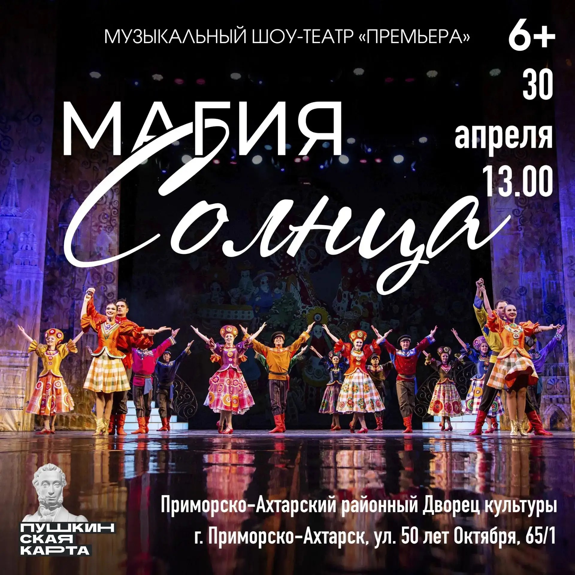 «Магия Солнца» – это незабываемое путешествие по самым разным уголкам нашей планеты! Это 400 роскошных костюмов и более двадцати оригинальных танцевальных и вокальных композиций! Многообразная и утончённая восточная культура, молдавские, еврейские, баварские танцы и песни, романтика летних ночей Италии и Франции, и, конечно, удалая русская пляска в исполнении солистов-вокалистов и балета Музыкального шоу-театра «Премьера» – всё это «Магия Солнца»! Спектакль, который не устаёт собирать аншлаги со дня постановки. Ссылка на покупку билетов
