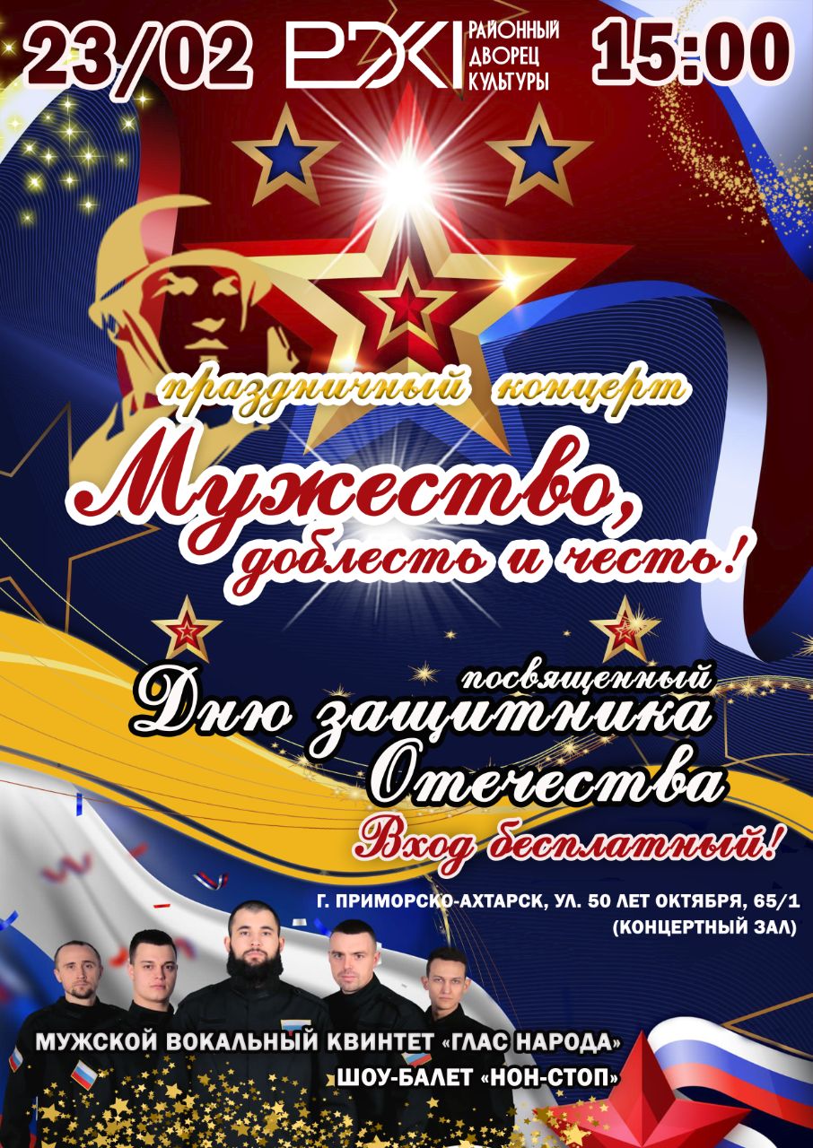 23 февраля 2023 года в 15:00 часов в районном Дворце культуры по адресу г. Приморско-Ахтарск, ул.50 лет Октября,65/1 (концертный зал) состоится праздничный концерт «Мужество, доблесть и честь!», посвященный Дню воинской славы России — Дню защитника Отечества.