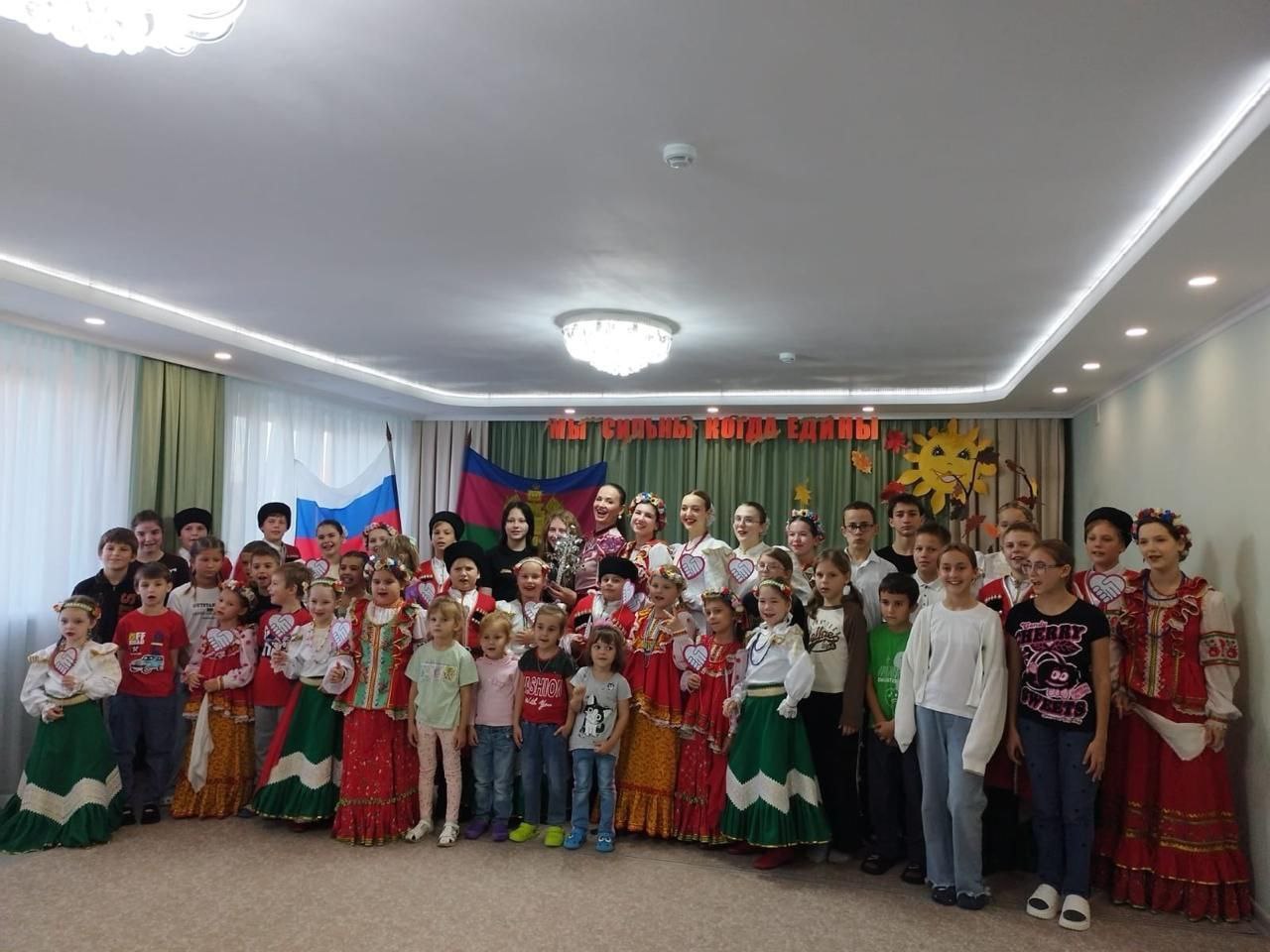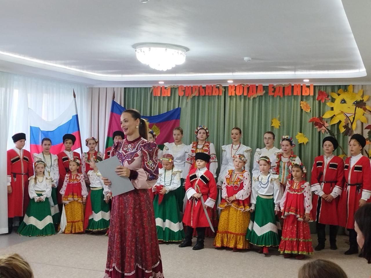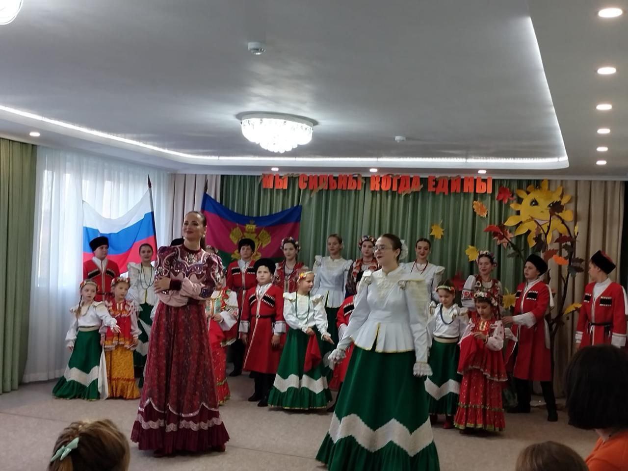 В преддверии празднования Дня народного Единства в Приморско-Ахтарском социально- реабилитационном центре для несовершеннолетних состоялся концерт "Мы сильны, когда едины!". Образцовый ансамбль казачьей песни "Казачата" под руководством заслуженной артистки Краснодарского края Притыка Яны Алексеевны подготовили творческую программу с песнями и играми.