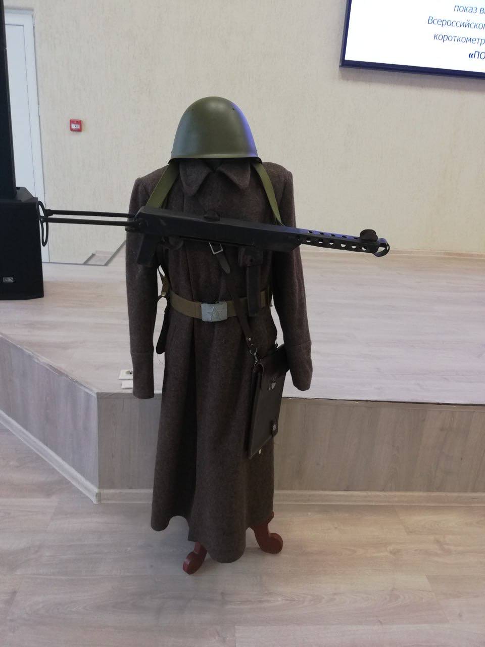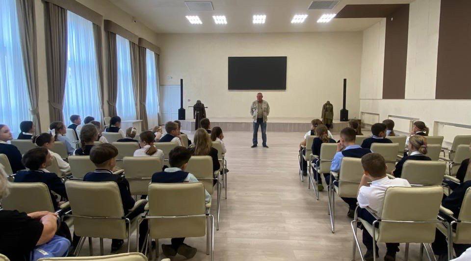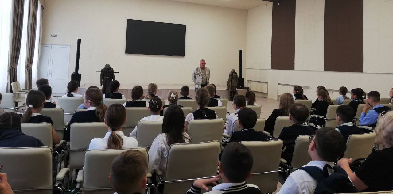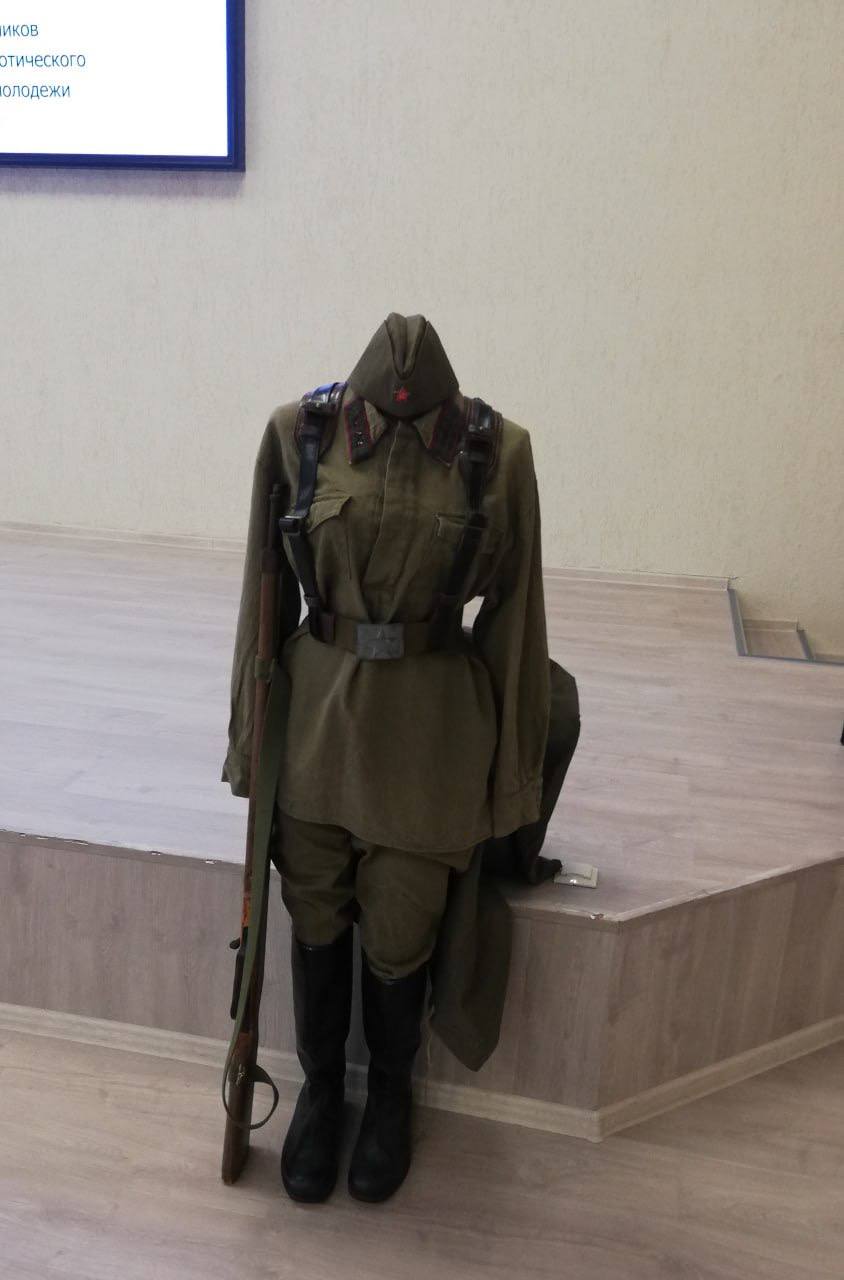 Руководитель историко-патриотического кружка «Патриот» Валерий Чернов рассказал о тяжелом периоде оккупации немецкими захватчиками родного края, о героических сражениях за каждый населённый пункт, а также показал присутствующим образцы формы, которую носили солдаты в зимнее и летнее время в 1943 году.